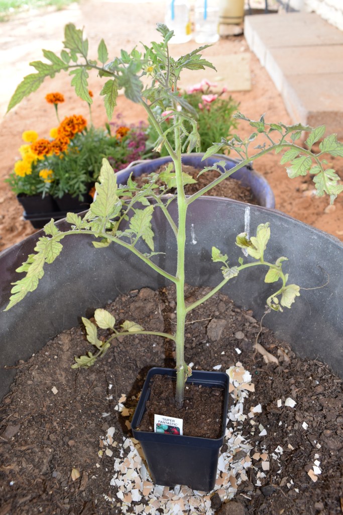 I fill my pot or container 3/4 full with soil, or potting mix. I make an hole for plant, making sure the bottom of the planting hole is 4 inches above the bottom of the container. Next I add crushed egg shells to add calcium to aid in the prevention of blossom end rot, a nutrient deficient disease.
