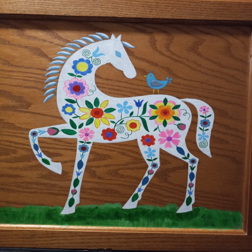 When I got home, I decided I did not like the colors on a brown horse. There was not contrast with the background if the main color of the horse and the background were both woodgrain brown. So I painted the horse white. Then colors began to evolve. Then other things became more important, so the painting was put aside.