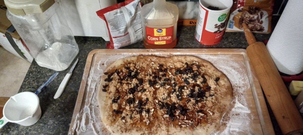 After the dough has doubled and is ready to become cinnamon rolls, this is where I get creative. I will roll the dough into a rectangle, sprinkle with cinnamon almost covering the dough entirely. Then I sprinkle on 1/3 cup of brown sugar, add raisins and pecans to my desired amount. Now for a secret ingredient I learned from an aunt, pour some corn syrup over the mix, not a lot of corn syrup, about 1/2 to 3/4 cup, to help the brown sugar melt and soak into the dough during baking.