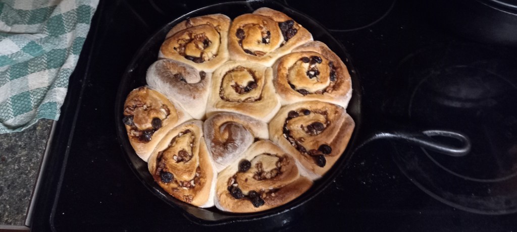 Next roll up the dough, gently squeezing together as you roll. Once rolled, pinch the edges together. Then I cut 1 inch slices and place in a greased cast iron skillet. Do not place too tight together, as the dough has to rise again. After about 1 1/2 hours, they are ready to bake in the oven at 375 degrees fahrenheit for 25 to 30 minutes, or until golden brown.