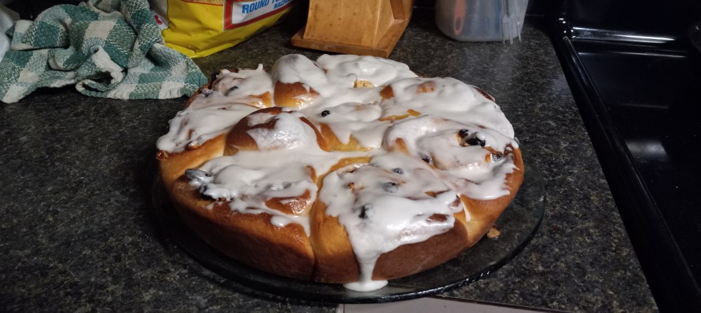 A Christmas tradition is homemade Cinnamon Rolls loaded with raisins and nuts, covered with a sweet frosting. Tradition is to bake the cinnamon rolls on Christmas Eve. We open gifts on Christmas Day. When everyone woke up on Christmas morning, each would get a cinnamon roll, then sit down as gifts were handed out and opened. Cinnamon rolls were pre-breakfast snack. Once all the gifts were opened, the living room picked up, I would start cooking breakfast, and then Christmas dinner.