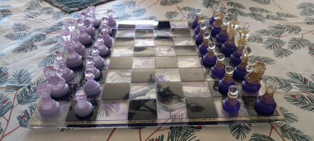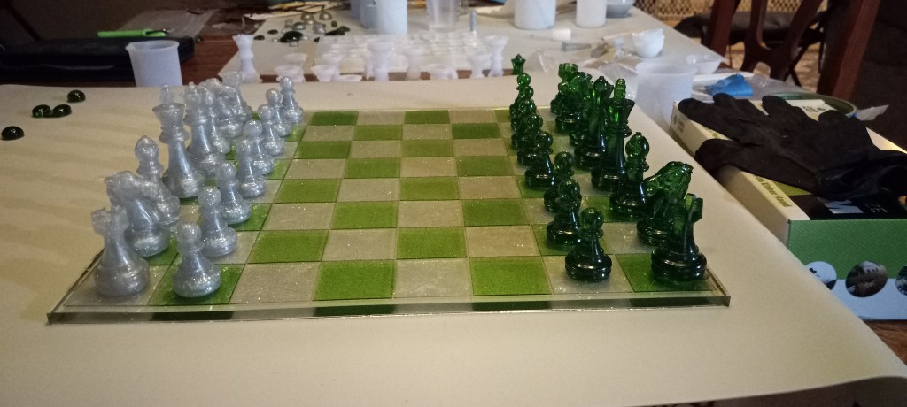 Since we both love playing chess and my chess board and pieces are on the small side, we thought it would be great to create a chess game with epoxy resin. I ordered the molds and we worked on creating a chess game for him. We had fun learning how to mix the colors and the tedious pouring of one square at a time. The uniqueness of creating a one of a kind chess game thrilled us as we worked together. Upon completion we observed that the colors were not as strong as we desired, but still an eye catching chess game. He took the chess game home at the end of our visit. A reminder of the activities of that year’s summer visit.