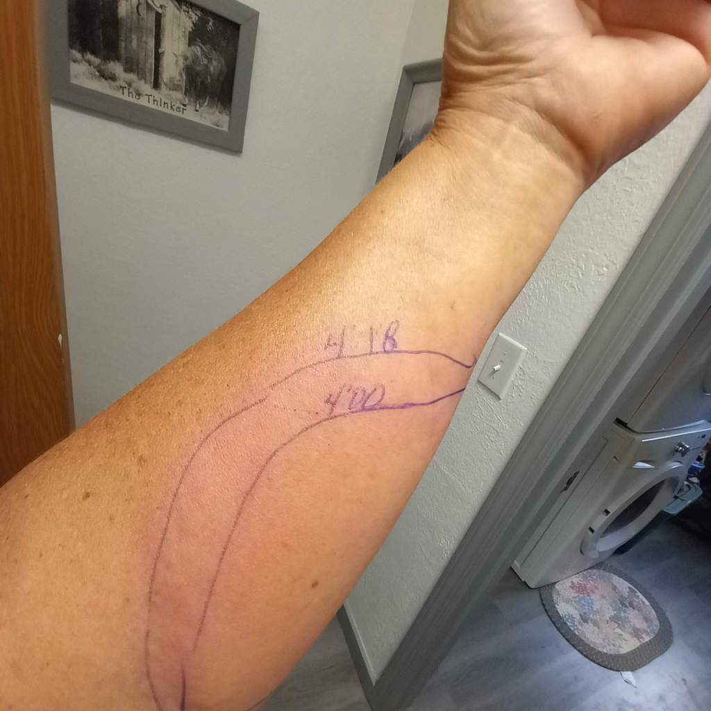 When she had placed me in the room (approximately 5 PM), the swelling was past my elbow and my forearm almost twice the size compared to the other forearm. She looked at my arm and appreciated the fact that I had drawn outlines and placed times on the swelling, called mapping. She asked me where I had learned to do that, I said training for Mounted Search and Rescue with the Montezuma Sheriff’s Posse in Colorado. She diagnosed my arm as “very angry”. Good description.